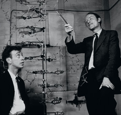 So Francis Crick and James Watson, helped by the work of Rosalind Franklin, didn’t discover DNA, but they did work out what it looked like. They struggled to conceptualize the exact shape of the molecule for years, and were helped enormously by Rosalind Franklin’s skill as an x-ray crystallographer.