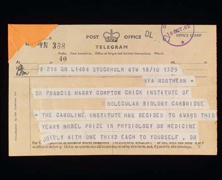 [Crick wins a Nobel Prize] Telegram to Crick announcing his Nobel Prize, 1962. He won the prize jointly with Watson and Dr Maurice Wilkins for their work on the molecular structure of DNA and ‘its significance for information transfer in living material’.