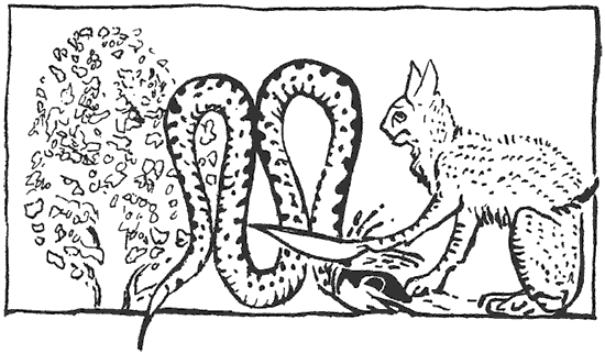 Глава XXXIII Книги мертвых направлена против Апопа, которого там зовут Ререк, теряющего свою силу перед лицом умершего, если он только упомянет имя Сепа или Шу. Умерший приказывает Ререку стоять, обещая ему съесть крысу, вызывающую отвращение у Ра, и кости «грязного кота». «Эй ты, змей Ререк, не двигайся. Смотри на Сепа и Шу. Не шевелись теперь, и ты будешь есть крыс, которые так отвратительны Ра, и ты будешь грызть кости этого грязного кота». А так как кот был эмблемой Ра, в этой роли он является убийцей змея тьмы, то трудно объяснить значение этого текста, если только мы не согласимся, что умерший человек надеялся обезоружить лестью врага, которого он не мог одолеть силой. Он не только обещает, что змей будет пожирать Кота-Солнце, но и то, что он будет есть крыс, которыми кот питается. Темнота будет проглочена как солнце, и серые тучи станут его добычей.[6]