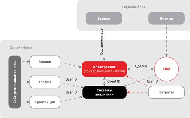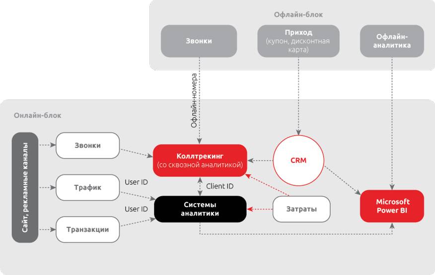 Схема позволяет отслеживать всю цепочку пути клиента вместе с офлайном. При необходимости офлайн-блок можно усилить телефонией, например для отслеживания работы курьеров. Можно определять эффективность каждого сотрудника, каждой офлайновой точки продаж.