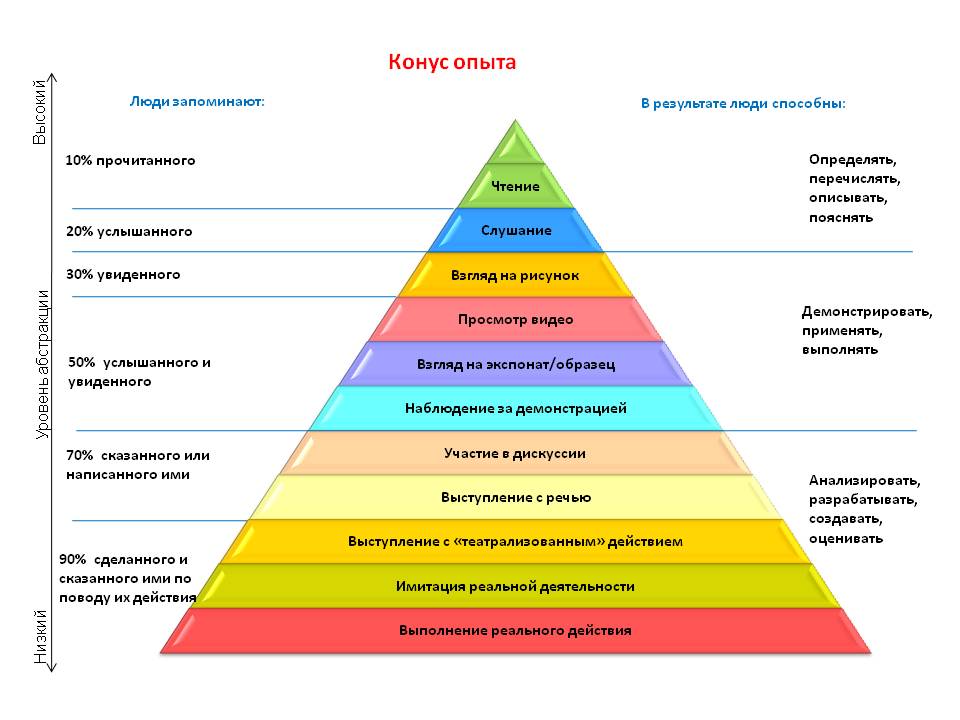 В 1946 году Эдгар Дейл – известный американский педагог, профессор Университета Огайо, выпустил книгу "Audiovisual Methods in Teaching", где впервые представил пирамиду восприятия информации в процессе обучения.