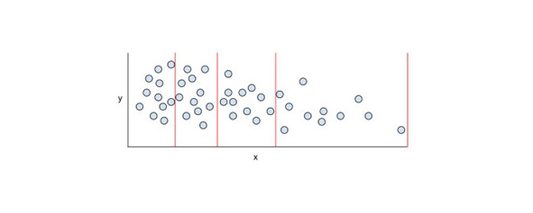 Квантильное группирование (Quantile bucketing) – это распределение значений объекта по сегментам таким образом, чтобы каждый сегмент содержал одинаковое (или почти одинаковое) количество примеров. Например, на следующем рисунке 44 точки разделены на 4 корзины, каждая из которых содержит 11 точек. Чтобы каждый сегмент на рисунке содержал одинаковое количество точек, некоторые сегменты охватывают разную ширину значений x405.