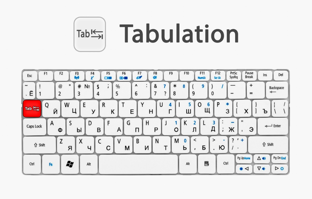 Название клавиши «Tab» – тоже аббревиатура от английского слова «Tabulation», «Табуляция». Эта клавиша имеет целый ряд исполняемых функций в зависимости от места ее использования (Текстовый редактор, Браузер, Компьютерная игра и так далее), а также от сочетания других клавиш вместе с клавишей «Tab».