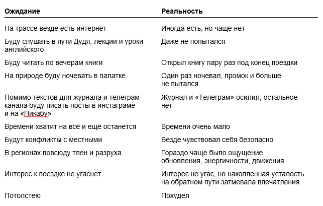 Саму поездку я тоже рисовал себе совсем не такой, какой она оказалась. Вот основные противоречия между ожиданием и реальностью.