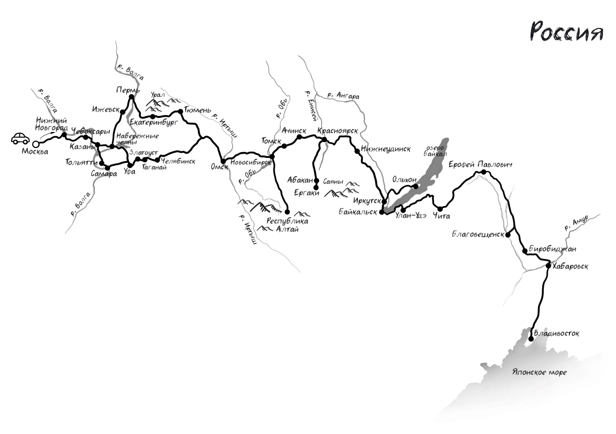 Мой маршрут был таким: Москва – Чебоксары – Набережные Челны – Ижевск – Пермь – Екатеринбург – Тюмень – Омск – Алтай – Ачинск – Красноярск – Абакан – Ергаки – Красноярск – Иркутск – Ольхон – Улан-Удэ – Чита – Ерофей Павлович – Благовещенск – Биробиджан – Хабаровск – Владивосток – Байкальск – Нижнеудинск – Томск – Новосибирск – Челябинск – Таганай – Златоуст – Уфа – Самара – Тольятти – Казань – Нижний Новгород – Москва.