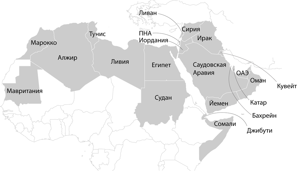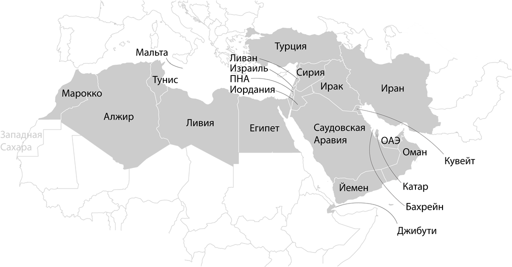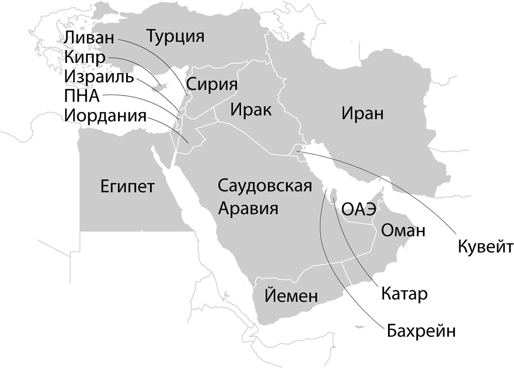 В разное время немного разные территории назывались и Ближним Востоком (англ. Near East), и Большим Ближним Востоком (Greater Middle East), и Средним Востоком (Middle East). Не будем также забывать про Левант[13], границы которого уже много столетий каждый трактует как ему захочется, и про Ближний Восток и Северную Африку (Middle East and North Africa – MENA) – термин, который часто употребляют на Западе, особенно в бизнес-кругах, но который тоже не даёт чёткого представления, о каких странах речь.