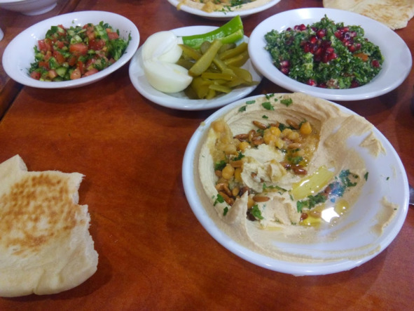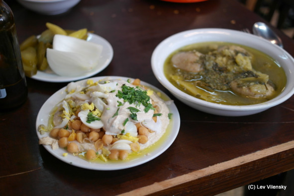 Впрочем, не только фалафелем славны иерусалимские закусочные, кухня которых вобрала в себя все лучшее, что есть у турок, курдов, арабов, марокканцев, румын и ашкеназских евреев. Хумус – основа основ арабско-турецкой кухни, питательная каша из мелко-мелко измельченного нута, сдобренная тахинным соусом и лимонным соком, с приправами, стандартными для любой закусочной, где хумус подается на тарелке – бобы «фуль», горячий нут, обжаренный мясной фарш, жареная куриная грудка, кедровые орешки и крутое яйцо, а сверху все это посыпано зелеными листьями кинзы. И – тоже традиционно – тарелочка с ломтиками сырого репчатого лука, кислых огурцов, и, иногда, маленького острого перчика. И зеленая острая перечная подлива. Только неумеха и турист ест хумус вилкой или ложкой, его надо «ленагев» – «вытирать», точнее, зачерпывать ломтиком поданной горячей питы, и съедать, откусывая намазанный кусок этой питы. Пока не станет чистой тарелка. Кто сказал, что нельзя вытирать хлебом тарелку, что это неприлично? Пожалуйте к нам – в иерусалимскую «народную» закусочную. В культовый «Пинати» на улице Мелех Джордж, в легендарный «Азура» на рынке Махане Иегуда, во вкусную «Хумусию» на улице Бен-Шетах – везде вы получите тарелку этого необычайно вкусного и питательного яства, пусть – для бедных, но очень богато греющего желудок как студенту, так и королю, как жене премьер-министра, так и старой арабской женщине, греющей усталые ноги свои на солнышке на открытой веранде хумусной закусочной в Старом Городе.