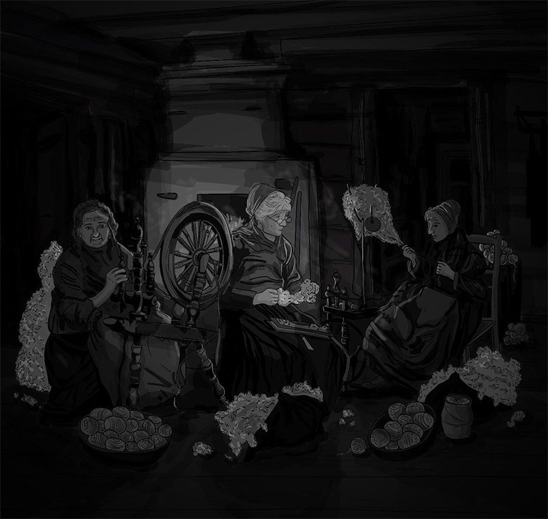 Бабушка не гонит её спать, а даёт совсем маленькую прялку. Соседки переглядываются, но ничего не говорят, у бабушки большая прялка, с колесом и другими приспособлениями, которые облегчат нелёгкий труд, а у Иришки маленькая, деревянная, без резьбы.