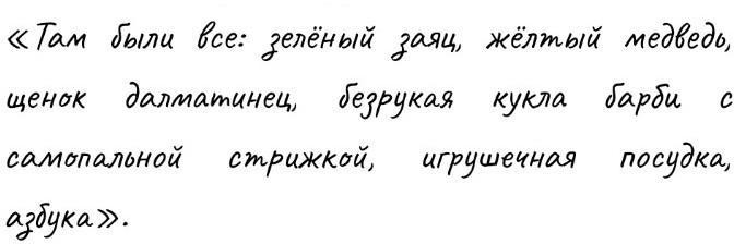 Срывается с места и плюхается обратно в кровать. Упс, трусы то ведь привязаны. Я довольная шла в школу, прокручивая в голове утреннюю шутку над сестрой и даже не подозревала, что когда прозвенит звонок на урок, и я открою свой рюкзак, то вместо учебников и тетрадей, обнаружу пакет, набитый мягкими игрушками. Там были все: зелёный заяц, жёлтый медведь, щенок далматинец, безрукая кукла барби с самопальной стрижкой, игрушечная посудка, азбука.