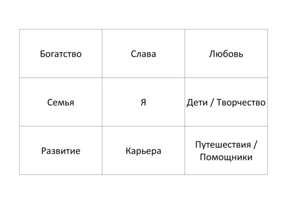 Наверное, ни для кого не секрет, что сфер жизни на Карте желаний – 9. Для всех напомню, что это: зона Я – в центре, и далее (по кругу с левого верхнего угла) богатство, слава, любовь, дети/творчество, путешествия/помощники, карьера, знания, семья.