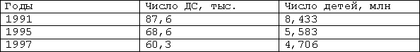 Таблица показывает, что значительно уменьшились не только количество ДС, но и их наполняемость. В целом по показателям 2000–2001 гг. системой дошкольного образования охвачено примерно 60 % детей. Резко уменьшилось количество ведомственных садов, переданных муниципальным органам. Плата за содержание детей значительно возросла. Дошкольные учреждения недостаточно финансируются государством и органами власти. Низок уровень заработной платы воспитателей.