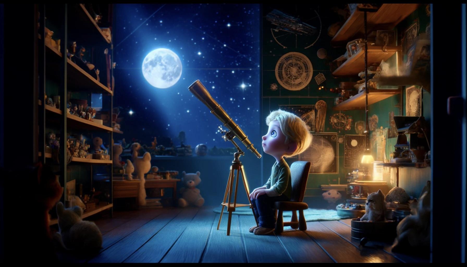 Волшебная ночьВ ту тёмную ночь, когда мир погрузился в спокойствие и мирные сны, яркая луна светила так ясно, что её свет, казалось, мог достать до самых тайных уголков сердца маленького мальчика по имени Оскар. Его комната была полна чудес – на стенах висели карты звёздного неба, а книжные полки скрипели под тяжестью книг о далёком космосе. В углу комнаты, среди моделей космических кораблей, стоял его верный телескоп.