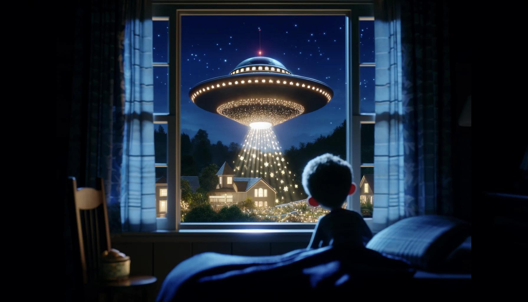 На заднем дворе его дома, словно сказочный замок, медленно опускался огромный космический корабль, усыпанный звёздами и странными символами, мерцающими в темноте ночи. Это было похоже на приглашение в неизведанное, и Оскар не мог устоять перед таким зовом.