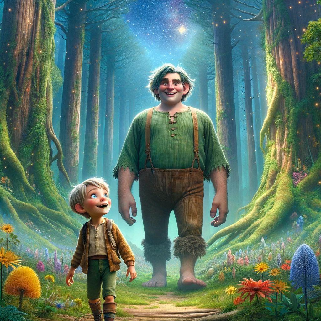 Встреча с БрумомНе успел Оскар насладиться миром гигантских растений, как из-за одного из деревьев вышло огромное существо, высотой с дом. Это был Брум, добрый великан с тёплыми глазами и улыбкой, которая сразу рассеяла всякую тревогу в сердце мальчика.