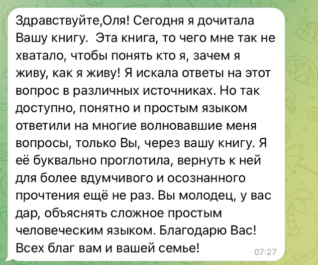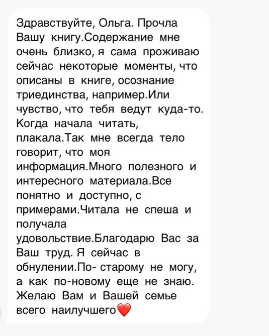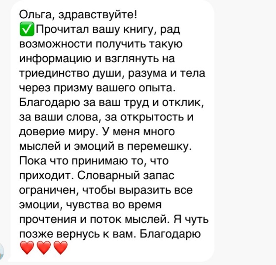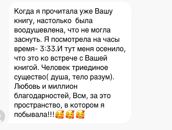 Села я за книгу 19 января 2023 года. Поначалу все шло гладко. Я просто садилась за ноутбук и пальцы сами набирали текст. Затем наступали моменты тишины. Я садилась за ноут, но внутри не было ни-че-го. В итоге за 9 месяцев моя рукопись была готова. Я испытывала такое благоговение, такой восторг, который невозможно описать словами. Я летала. Я испытывала счастье. Под воздействием этих чувств, уверенная в успех книги, осенью 2023 года я отправила рукопись в два издательства… и получила отказ. Я плакала несколько дней и ночей. Я проживала целый коктейль эмоций от злости до бессилия. Я не понимала, почему так произошло. Меня ж Высшие силы благословили на эту книгу, я же чувствовала важность и глубину своей книги. Почему отказ??? Что пошло не так? Пару месяцев я позволила себе побыть в том состоянии, прожить появляющиеся эмоции и уже из нового спокойного состояния в январе 2024 года села писать новый вариант книги. Появилась даже благодарность к издательствам, которые мне отказали, потому что мои знания и наблюдения более структурировались и я была готова все изложить заново. Имея основу в виде первой рукописи, вторая рукопись была готова уже в мае 2024 года. Этой же весной я закончила школу гипноза и познакомилась со своим Наставником и Высшим Я. Это прям отдельная тема, о которой расскажу позже. На тот момент у меня снова возник вопрос: «Что делать с новой книгой? Писать в издательства? Издавать самостоятельно? Отдать людям в том виде, который есть?» Ответ получила от своего Высшего Я на сеансе гипноза. Он мне четко сказал: «Отдай людям. Прям как есть. Тебя книга душит и выматывает. Делись ею». И я последовала совету. Я просто так начала отдавать людям ссылку на книгу в электронном варианте. Запросов было немного, так как мою теорию Триединства не совсем еще понимали, она очень сильно «расходилась» с традиционной психологией. Я терпеливо записывала видео, в которых рассказывала о насущных проблемах и делала акцент на свою книгу. Без ожиданий и без напряжения. Все это я уже к тому моменту прожила. И 23 сентября 2024 года моя книга «выстрелила». Утром я проснулась знаменитой. Когда я открыла свой аккаунт в соцсети, я сначала не поняла, что происходит. Более 2000 подписок за сутки и более тысячи запросов на книгу. И снова целый спектр эмоций поглотил меня. Я и плакала, и прыгала от счастья. Я благодарила Бога, всю Вселенную и каждого человека, который проявил интерес к моей книге. Я с радостью отправляла книгу каждому, кто делал запрос и взамен лишь просила обратную связь после прочтения. И дальше я стала получать отзывы о моей книге. Некоторые из них я хочу опубликовать здесь, уже в третьем новом варианте, в том виде, как они приходили мне.