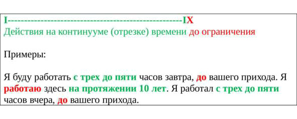 настоящем или прошедшем времени, произошедшие на континууме (отрезке времени) в будущем, настоящем или прошедшем времени, совершающиеся до другого действия или момента (к другому действию или дате) в будущем, настоящем или прошедшем времени.