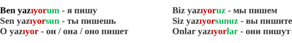 yazmıyorum (я не пишу), yazmıyorsun (ты не пишешь), yazmıyor (он не пишет)…