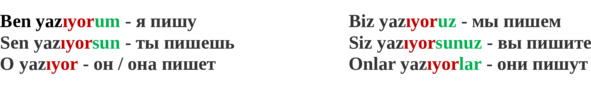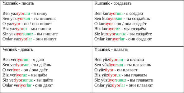Oturmak – сидетьBen oturuyorumSen oturuyorsunO oturuyorBiz oturuyoruzSiz oturuyorsunuzOnlar oturuyorlarkalkmak – вставатьBen kalkıyorumSen kalkıyorsunO kalkıyorBiz kalkıyoruzSiz kalkıyorsunuzOnlar kalkıyorlarasmak – вешатьBen asıyorumSen asıyorsunO asıyorBiz asıyoruzSiz asıyorsunuzOnlar asıyorlarkapatmak – закрыватьBen kapatıyorumSen kapatıyorsunO kapatıyorBiz kapatıyoruzSiz kapatıyorsunuzOnlar kapatıyorlarokumak – читатьBen okuyorumSen okuyorsunO okuyorBiz okuyoruzSiz okuyorsunuzOnlar okuyorlaryazmak – писатьBen yazıyorumSen yazıyorsunO yazıyorBiz yazıyoruzSiz yazıyorsunuzOnlar yazıyorlarsusmak – молчатьBen susuyorumSen susuyorsunO susuyorBiz susuyoruzSiz susuyorsunuzOnlar susuyorlaralmak – получатьBen alıyorumSen alıyorsunO alıyorBiz alıyoruzSiz alıyorsunuzOnlar alıyorlargitmek – идтиBen gidiyorumSen gidiyorsunO gidiyorBiz gidiyoruzSiz gidiyorsunuzOnlar gidiyorlarvermek – даватьBen veriyorumSen veriyorsunO veriyorBiz veriyoruzSiz veriyorsunuzOnlar veriyorlar