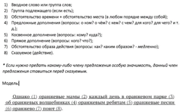 Подлежащее + обстоятельство времени + обстоятельство места + (Как? Сколько? Зачем? Почему? Что?) + сказуемое.