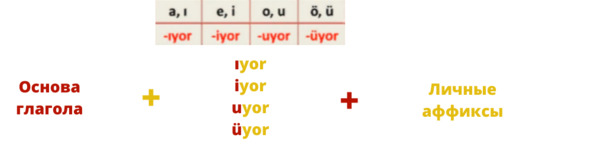 Ранее мы уже выяснили, что инфинитивы турецких глаголов имеют окончания -mek / – mak. Для того, чтобы поставить глагол в форму 1-го лица единственного числа, следует к основе глагола прибавить аффикс -iyor / ıyor + личный аффикс 1 лица единственного числа -um, например: