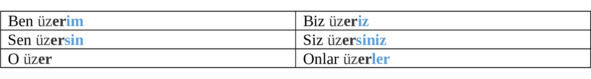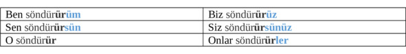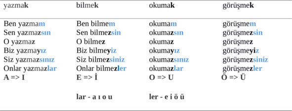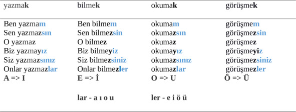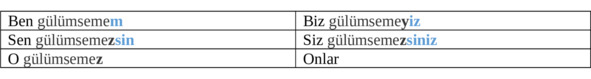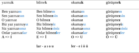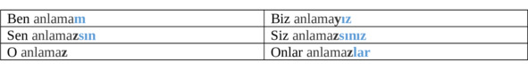 Отрицательная форма настоящего-будущего времени образуется путем присоединения отрицательного аффикса -maz / -mez. Исключение составляют формы 1-ого лица единственного и множественного чисел (ben, biz). Для них отрицательная форма образуется с помощью аффикса -ma / -me. В форме 1-ого лица множественного числа между отрицательным аффиксом и личным окончанием вставляется интерфикс y. За отрицательным аффиксом следуют личные окончания.