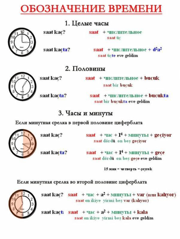 В 12.15 (saat on ikiyi on beş geçe) = (saat on ikiyi çeyrek geçe),В 12.25 (saat on ikiyi yirmi beş geçe),В 01.10 (saat biri on geçe),В 01.20 (saat biri yirmi geçe),В 04.15 (saat dörtü on beş geçe) = (saat dörtü çeyrek geçe),В 04.27 (saat dörtü yirmi yedi geçe).Во второй половине часа