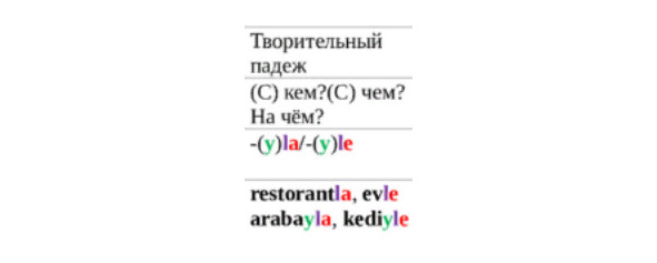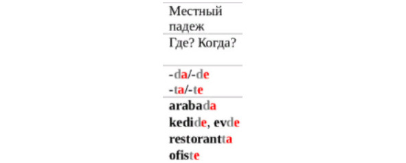 Otobüs.. (творительный пад.) (автобусом) ofis.. (притяжательный афф. + направительный пад.) (в мой офис) gitmek.. (еду).