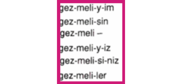 Cumartesi (субботние) ve (и) Pazar (воскресные) gün.. (притяжательный афф. 3 л. мн. ч., далее 3 л. мн. ч.) (дни) hariç (кроме) her gün (каждый день кроме субботы и воскресенья) oğul.. (выпадение гласной + притяжательный афф.) (мой сын) Huanito Oliva Morales (Хуанито Олива Моралес), ev.. (притяжательный афф. + исходный пад.) iki dım öte.. (местный пад.) (в двух шагах от нашего дома) okul.. (направительный пад.) (в школу) gitmek (ходить) zorunda (должен). – Каждый день кроме субботы и воскресенья мой сын Хуанито Олива Моралес должен ходить в школу, которая находится в двух шагах от нашего дома.