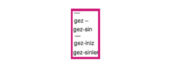 Önce (сначала) tuvalet.. (направительный пад.) (в ванную комнату) koşmak.. (настоящее продолженное вр.) (он бежит), sonra (потом) şimşek.. (творительный пад.) (молнией) mutfak.. (смена согласной + направительный пад.) (на кухню) koşuyor (бежит) ve (и) sonunda (наконец) ben.. (притяжательное местоимение + творительный пад.) (со мной) vedalaştık.. (исходный пад.) sonra (попрощавшись) ev.. (исходный пад.) (из дома) koşmak.. (конверб -arak/-erak) koşmak.. (настоящее продолженное вр.) (выбегает) ve (и) okul.. (направительный пад.) (в школу) gitmek.. (настоящее продолженное вр.) (направляется).