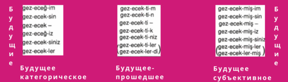 Ещё одной особенностью в формообразовании будущего времени является смена буквы k на ğ в позиции между двумя гласными при присоединении окончания: