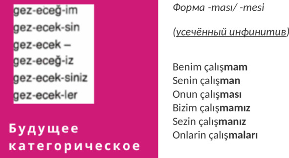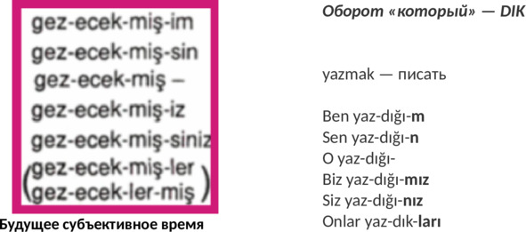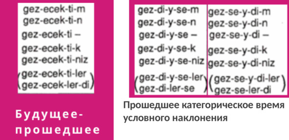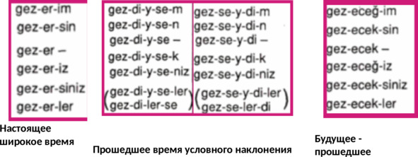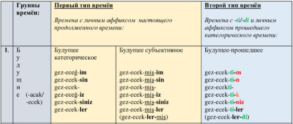 Если говорить про личные аффиксы во временах турецкого языка, то все 17 времён можно разделить на 2 типа:
