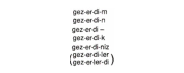 Öğrenci.. (мн. ч.) (студенты) Turkiye’.. (родительный пад.) her bir yöre.. (афф. 3 л. ед. ч. + буфер + исходный пад.) gelmek.. (прошедшее длительное вр.) (съезжались со всех уголков Турции).