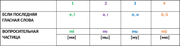Вопросительная частица mi, mı, mu, mü ставится после слова по закону гармонии на 4.