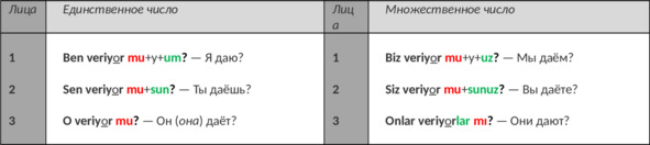 Пример: vermek (давать) => ver+iyor — он (она) даёт => veriyor mu+y+uz [муюз]? — мы даём?