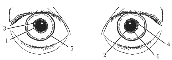 Рис. 2. Структуру радужки: 1 – зрачок; 2 – зрачковая кайма; 3 – автономное кольцо; 4 – зрачковый пояс; 5 – лимб; 6 – цилиарный пояс