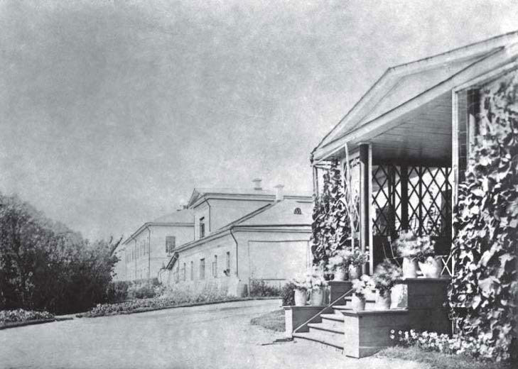 Пушкин[3]Наша усадьба была расположена на высоком левом берегу реки Непрядвы, приблизительно с версту ниже устья впадающей в нее речки Буйчика. Дом был одноэтажный, длинный; он состоял из трех частей: из средней, деревянной, и из двух почти одинаковых кирпичных флигелей с мезонинами по сторонам средней части; только флигель, который был с восточной стороны, был соединен со средней частью дома так называемой «нижней» гостиной и огибавшим ее с северной и западной стороны коридором, тогда как западный флигель стоял отдельно.