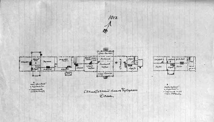 План дома Олсуфьевых в Красных Буйцах. Чертеж Ю. А. Олсуфьева с указанием названий комнат. Из экземпляра «Воспоминаний» в Российской Государственной библиотеке, Москва