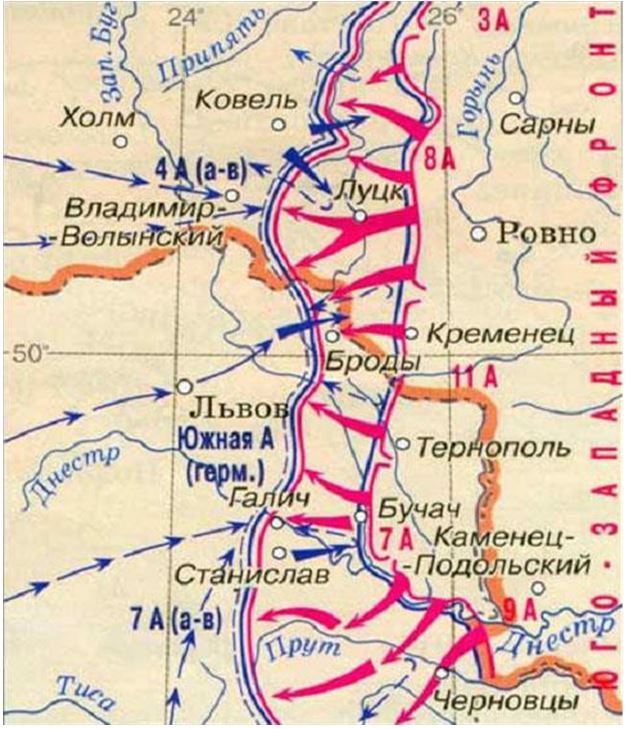 На левом фланге Юго-Западного фронта к 13 июня 9-ая армия под командованием легендарного генерала от инфантерии, уроженца Гродненской губернии, Платона Алексеевича Лечицкого прорвала фронт, занимаемый 7-ой австро-венгерской армией и, перемолов её во встречном сражении, продвинулась на 50 км, взяв почти 50 тысяч пленных.