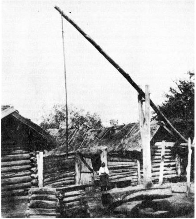 И теперь, сделав сруб из дуба и ольхи, он вырыл в своём хозяйственном дворе колодец глубиной около шести метров, из которого воду также поднимали с помощью журавля.