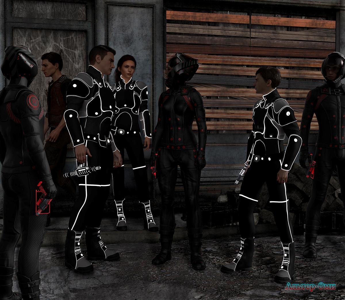 – Не мы, – Эллиот осмотрелся. Судя по направлению лучей, стреляли с двух сторон и, скорее всего, сверху. Элл включил силовое поле себе и Кэтролл и, схватив её за руку, потащил к стене. Чен тоже провёл ладонью по поясу, и его фигуру закрыло небольшое белое сияние. Он двигался немного позади остальных, пытаясь рассмотреть нападающих, но никого не было видно. Ёрк недолго думая втиснулся между ними, и тут лучи замелькали со всех сторон. Банда кинулась врассыпную.