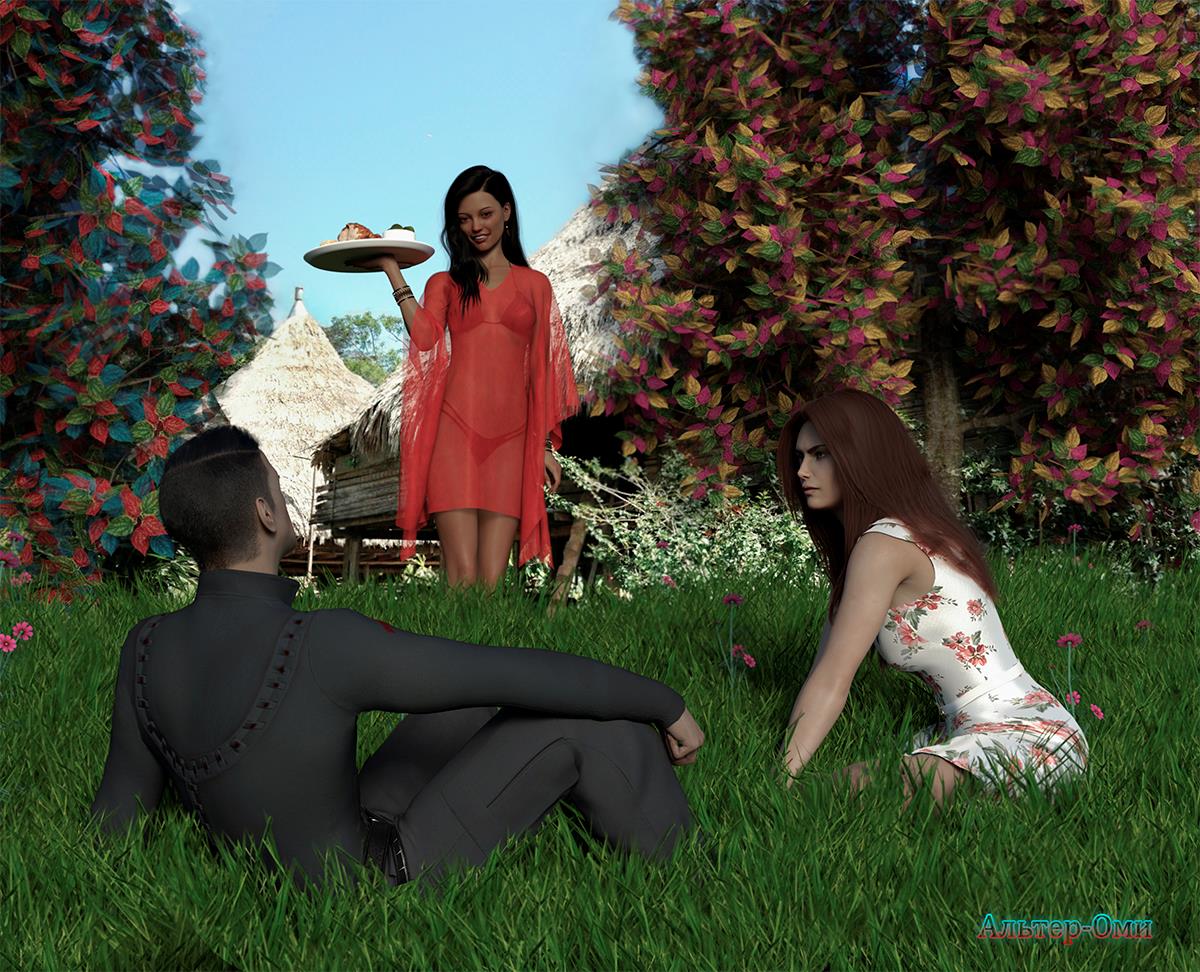 Элл лишь улыбнулся ей в ответ. Флэр же была настолько ошарашена, что забыла о своих спутниках и рассматривала каждую травинку, каждую букашку у своих ног. Старики на третьем уровне рассказывали детям о больших и красивых лесах, о кронах деревьев, которые шумят на ветру, но она не думала, что это выглядит настолько красиво. Листва деревьев напомнила ей тот восторг, который она испытала, первый раз увидев океан. Флэр подняла голову и заметила, как из домика вышла красивая девушка. Длинный тёмный волос оттенял смуглое лицо с высокими скулами. Девушка шла босиком, а из одежды на ней была лишь полупрозрачная накидка, под которой угадывался крохотный купальник, в руках она держала поднос, наполненный едой. Подойдя к костру, красавица улыбнулась и начала расставлять тарелки на невысокий столик, стоящий прямо на траве.
