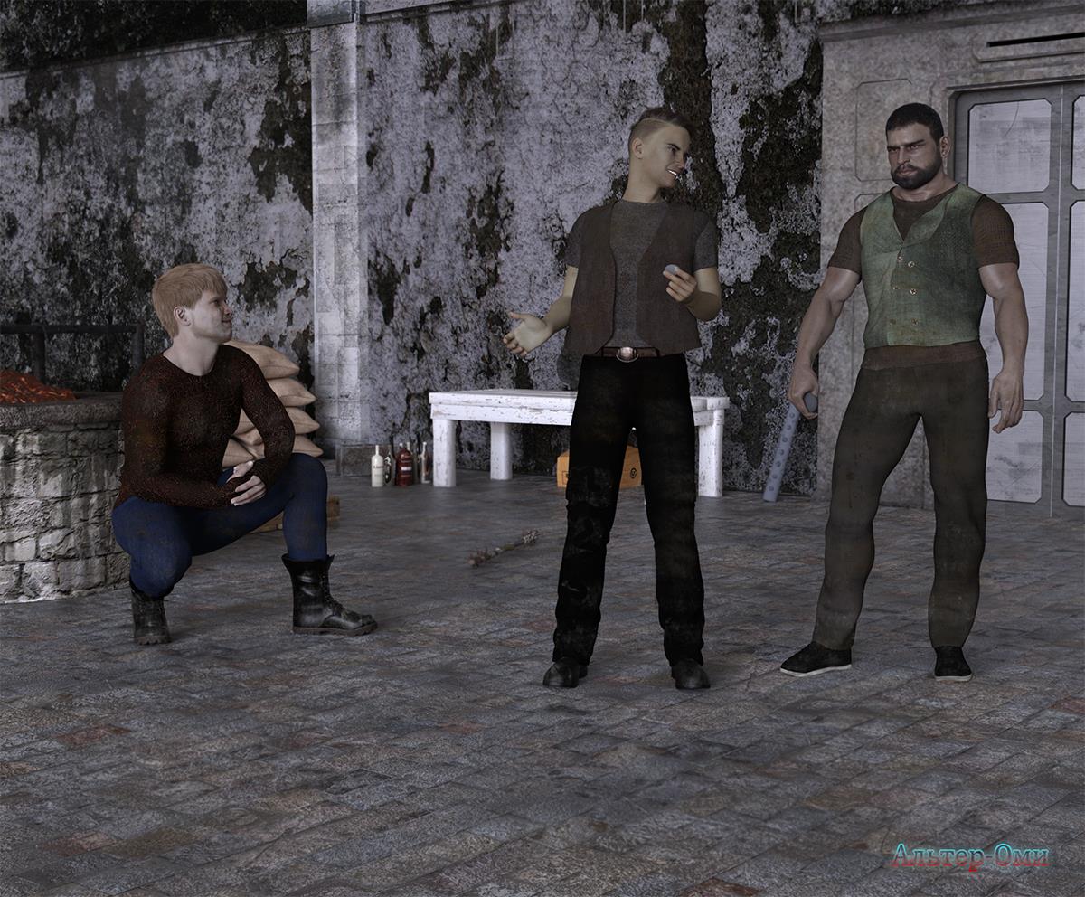 Банда выбрала один из самых хорошо сохранившихся домов. В нём даже были не разбитые окна и целая крыша. Во дворе трое мужчин пытались попасть камнями в железную кружку, стоящую шагах в пятнадцати от них. Когда камень попадал в цель, кружка отлетала дальше, и дистанция становилась больше, следующий везунчик откидывал её ещё дальше.