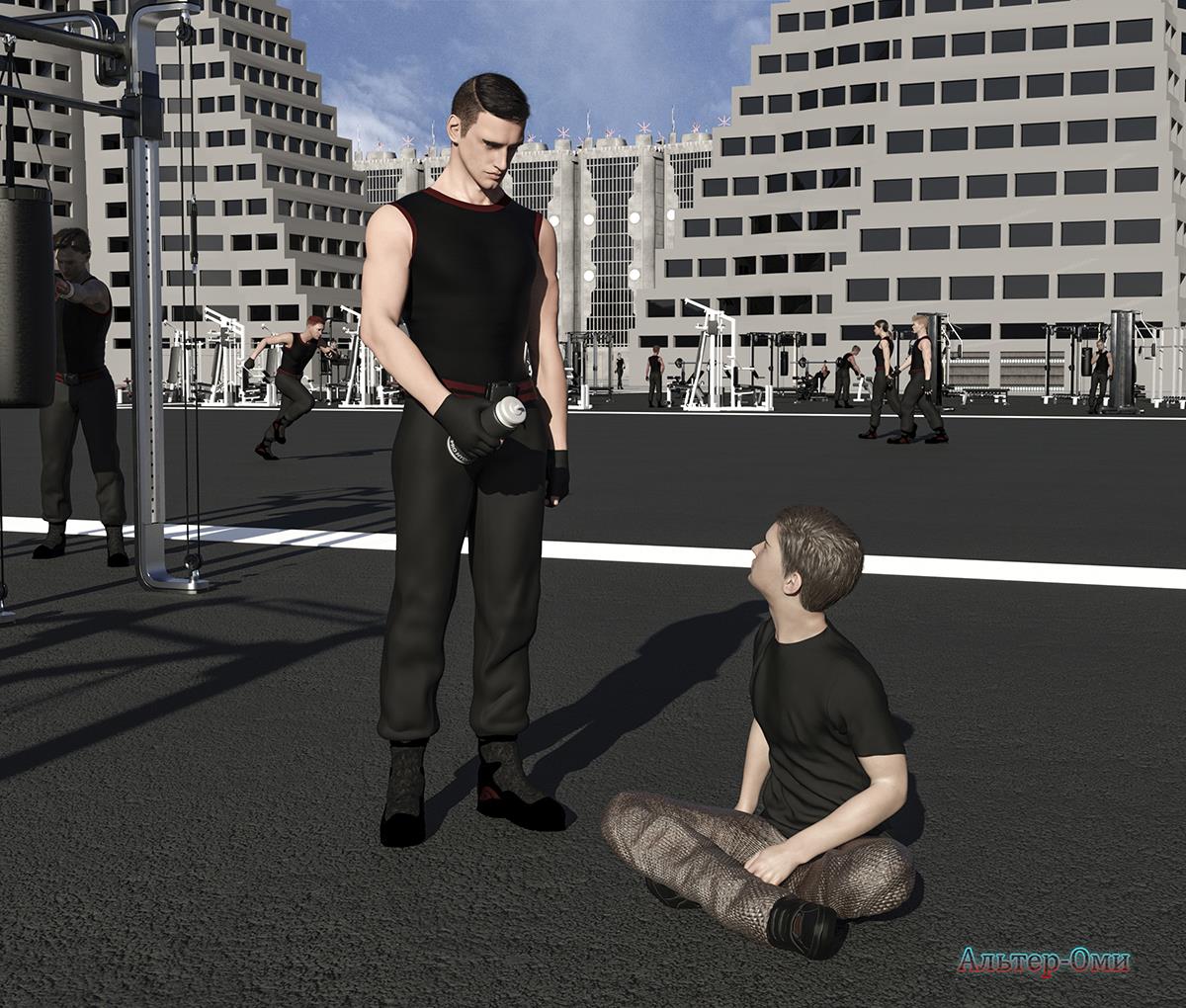 Их взвод неторопливо подбежал к самому дальнему сектору. Элл с любопытством осматривался, всё здесь было непривычно и интересно. Взвод остановился, но команд не было, и половина бойцов просто уселась прямо там, где стояла. Остальные или смотрели, чем занимаются другие взводы, или болтали, воспользовавшись свободной минутой. Эллиот подошёл к краю сектора, символично ограниченного светлой полосой. На соседней площадке с удовольствием тягали веса. Гири мелькали в воздухе, сопели и потели бойцы. Элл засмотрелся на одного из них, больше похожего на гору. Он и правда был интересен. Высокого роста со светло-русым волосом и огромной грудой мышц. Даже Грей рядом с ним казался щуплым. Гора сидел на скамейке, видимо, отдыхая, и с важным выражением лица держал в руке огромную гантель.