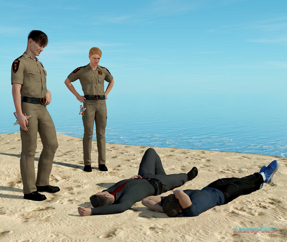 Через несколько минут оба задремали, не обращая внимания на палящее солнце. Но долго поспать им не дали. Пляж был личным владением корпорации и находиться здесь разрешалось лишь работникам и владельцам. Берег патрулировал теас (аналог полиции), вот и сейчас двое патрульных остановились рядом с нарушителями, заслонив им солнце. Чен сразу же проснулся, а Элл всё так же мирно дремал, прикрыв лицо рукой.