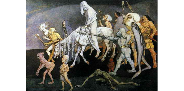 Из истории и фольклора известно, что празднованию Самайна посвящён один из ключевых кельтских эпосов «Разрушение дома Да Дерга», где описывается разрушение и возрождение миропорядка в образе ритуальной гибели короля во время поединка с предводителем тёмных сил, последующее воскрешение монарха и восстановление миропорядка вещей.