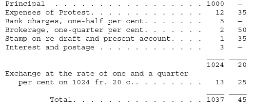 ACCOUNT OF EXPENSES OF PROTEST AND RETURNTo one bill for one thousand francs, bearing date of February the tenth, eighteen hundred and twenty-two, drawn by Sechard junior of Angouleme, to order of Lucien Chardon, otherwise de Rubempre, endorsed to order of Metivier, and finally to our order, matured the thirtieth of April last, protested by Doublon, process-server, on the first of May, eighteen hundred and twenty-two. fr. c.