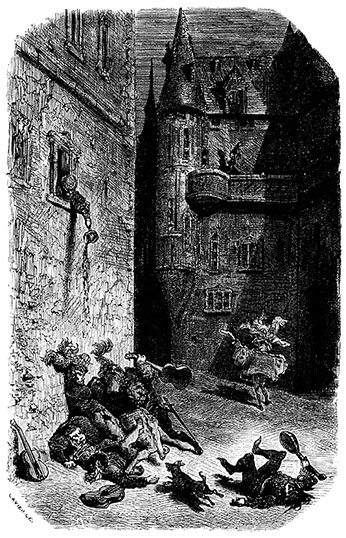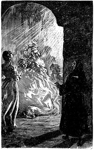 С наступлением ночи молодой наш туренец, подстрекаемый самолюбием и обуреваемый страстью, задыхаясь от волнения, проскользнул, как уж, в жилище истинной королевы собора, ибо пред нею склоняли главы свои все столпы церкви, мужи закона и науки христианнейшей.