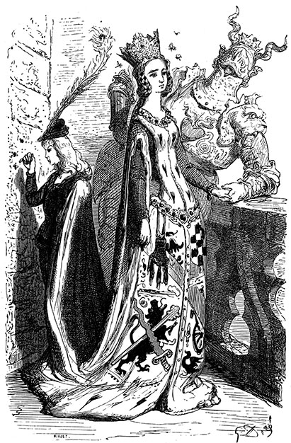 Когда наступил день, она надела подвенечный наряд, спокойно дождалась, пока ее муж отправился по делам, и пошла по улицам города искать короля. Но ей не пришлось долго бродить, потому что по приказанию Его Величества один из королевских прислужников крутился рядом с домом адвоката и, недолго думая, обратился к новобрачной, пока еще не ставшей женой: