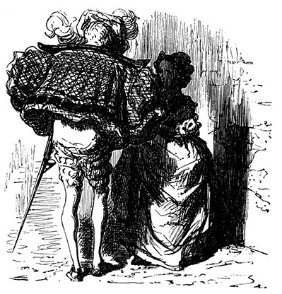 – Ах, сир, – вздыхает красавица, – завтра я выхожу замуж. Но ежели вы уступите мне кинжал, что висит у вас на поясе, я сумею защитить мой цветок и сохранить его для вас, дабы последовать словам Писания, гласящим: «Кесарю – кесарево».