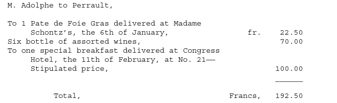 Caroline examines the dates and remembers them as appointments made for business connected with Chaumontel’s affair. Adolphe had designated the sixth of January as the day fixed for a meeting at which the creditors in Chaumontel’s affair were to receive the sums due them. On the eleventh of February he had an appointment with the notary, in order to sign a receipt relative to Chaumontel’s affair.